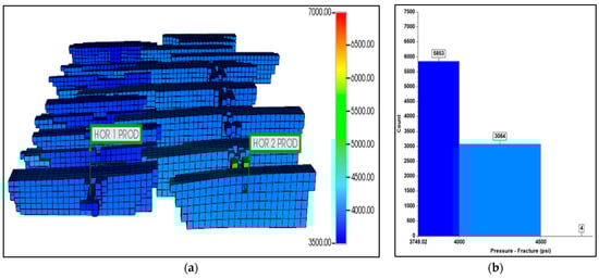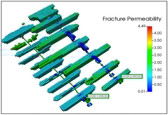 The numerical model employed for this study was a dual-permeability model, which was developed using the Computer Modelling Group (CMG)—GEM reservoir simulator. This widely accepted simulator allows for the detailed representation and simulation of fluid flow and other geomechanics–hydrodynamic behaviors. The entire reservoir is discretized into 103 × 101 × 6 grid blocks in the x, y and z directions, with total lengths in x- and y-direction of 5150 ft and 2500 ft, respectively. The vertical extent of the reservoir, from top to bottom, ranges from 11,300 feet to 11,500 feet below the surface, giving an average formation thickness of 250 feet. This detailed grid setup deployed formation tops and well logs of four nearby vertical wells in the Wolfcamp A formation, allowing a precise simulation of the field operations. A summary of the critical reservoir properties is provided in Table 1, which includes data on porosity, permeability and other relevant petrophysical and geomechanical parameters.