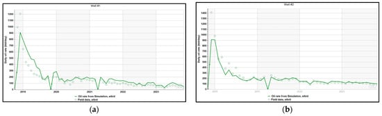 (a) History matching oil rate Well #1; (b) history matching oil rate Well #2.