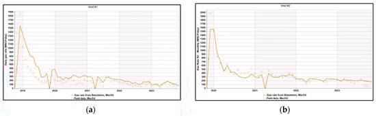 (a) History matching gas rate Well #1; (b) history matching gas rate Well #2.