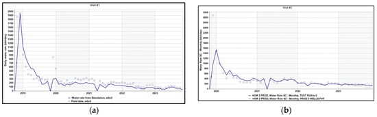 (a) History matching water rate Well #1; (b) history matching water rate Well #2.