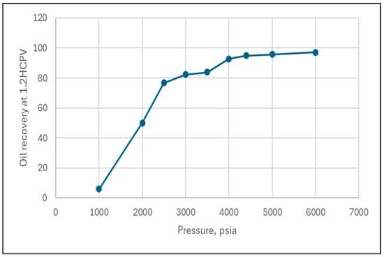 To estimate the MMP between the injected CO2 and the oil composition for the study area—the Wolfcamp A reservoir—a comprehensive suite of slim tube simulations was conducted using the CMG-GEM software 2024.20.5.811. These simulations are essential for determining the pressure at which CO2 can effectively mix with the reservoir oil without forming two separate phases. By conducting these slim tube simulations, which mimic the reservoir conditions and fluid interactions, it was able to accurately establish an MMP of approximately 4300 psi (Figure 15). This value is critical for designing and optimizing enhanced oil recovery processes, as it ensures that the injected CO2 will efficiently mix with the reservoir oil, thereby improving recovery rates and maximizing production from the investigated formation.