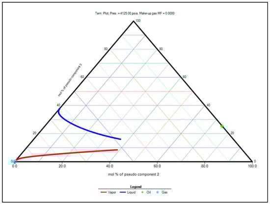 The oil composition data (Table 4) and the component properties (Table 5) of PVT for the Wolfcamp A formation are provided below. The composition presented in Table 4 was based on the Bonespring formation laid right above the Wolfcamp A formation []. The C7+ fraction has been de-lumped into four pseudo-components to ensure a more accurate PVT model. In this study, PVT calculation and properties interactions among various compositions were performed through an equation-of-state simulator to feed the hydrodynamic modeling performed by numerical simulation. This is the preferred method for the determination of MMP, where the laboratory-measured phase behavior data are available for fine-tuning an equation of state.