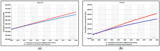(a) Cumulative oil production of Well #1 associated with 1 MMscf/d CO2 injection; (b) cumulative oil production of Well #2 associated with 1 MMscf/d CO2 injection.