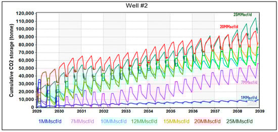 Figure 19 expresses the mass of CO2 storage corresponding with different CO2 injection rates. When the injection rate increases from 1 MMscf/d to 20 MMscf/d, the total amount of CO2 storage increases significantly from 10,000 to 80,000 tonnes over ten years. From 20 to 25 MMscf/d, the CO2 storage only increased by 10,000 tonnes. This observation emphasizes the importance of performing sensitivity analysis on the CO2 injection rate because it supports operators in determining the suitable rate considering the supplement of CO2. It is worth mentioning that CO2 supply is one of the most expensive and decisive components relating to field development and management. Additionally, the more CO2 is injected, the higher the required capacity of surface equipment. Finally, the CO2 injection rate should comply with the maximum allowable injection pressure allowed by law to avoid any unintentionally induced fractures in the formation. By adopting these results, one can optimize CO2 huff-n-puff operational costs while maximizing oil recovery.