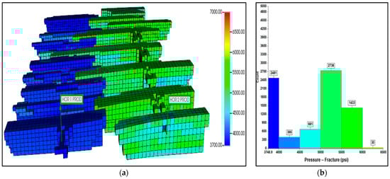(a) Pressure distribution after 10 years with 20 MMscf/d of CO2 injection; (b) pressure histogram at the end of CO2 huff-n-puff simulation.