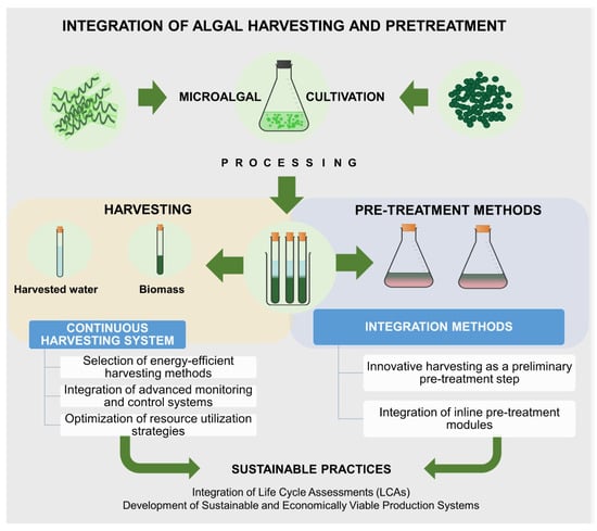 The integration of harvesting and pretreatment processes in microalgal biomass production plays a key role in enhancing overall efficiency and streamlining downstream processing for applications like biofuel production. This approach is essential for optimizing resource use, minimizing energy consumption, and improving the economic viability of microalgae cultivation. As identified in recent research, the key aspects of this integration include research exploring the development of continuous harvesting systems that seamlessly integrate with pretreatment processes [82]. These systems enable the continuous removal of microalgal biomass while subjecting it to pretreatment methods. Continuous systems improve overall productivity by minimizing downtime and maintaining optimal conditions for both harvesting and pretreatment [83]. In-line pretreatment modules, when placed within the photobioreactor systems, facilitate direct biomass treatment and eliminate the need for additional time, thus making it efficient. This approach brings down the operational costs, reduces the physical space occupied by the biomass system, and spatially guarantees the right environment for treatment immediately after the biomass is harvested. Emerging technologies such as membrane photobioreactors (MPBRs) and ceramic hydrophobic membranes enhance nutrient recovery and the CO2 solution in the process, increasing overall productivity [84]. In-line modules can include mechanical, chemical, or biological pretreatment steps, ensuring a more streamlined and space-efficient production process [85]. Innovative research has explored the utilization of harvesting methods as a preliminary step in pretreatment. For example, mechanical harvesting techniques such as centrifugation or filtration are engineered to induce mild stress on microalgal cells, initiating a pretreatment effect. This integrated approach minimizes the number of processing steps and optimizes resource utilization [63]. The importance of selecting energy-efficient harvesting methods that align with the subsequent pretreatment steps has been increasingly recognized. Integration strategies aim to harmonize the energy demands of harvesting and pretreatment processes to enhance overall sustainability. For example, energy generated during harvesting, such as in electro-harvesting techniques, can be effectively utilized in the following pretreatment stages. Synergistic protocols involve tailoring the harvesting and pretreatment methods to work collaboratively, taking advantage of their complementary effects [86].
