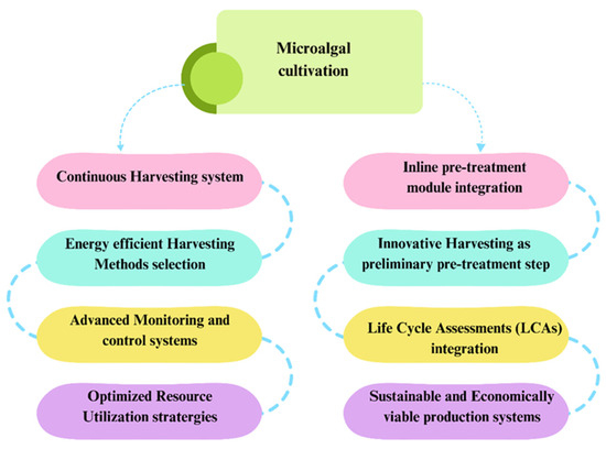 Research on harvesting and pretreatment technologies for microalgal biomass has shown significant improvements, which can help solve problems related to efficient biomass recovery and processing. The development of novel harvesting methods has been a key focus, with the aim of streamlining the harvesting process and enhancing overall productivity. Some studies have examined the use of flocculation agents, which cause microalgae cells to stick together, making sedimentation easier and easier to separate. Various natural and synthetic flocculants have been studied to identify the most effective and environmentally friendly option [62]. These methods offer a cost-effective approach for concentrating microalgal biomass and simplifying subsequent harvesting steps. Centrifugation and filtration techniques have been refined to improve efficiency and reduce energy consumption during harvesting. High-speed centrifugation allows for the rapid separation of microalgal biomass from the culture medium, whereas advanced filtration systems, such as membrane filters, offer a scalable solution for harvesting [63]. Research findings emphasize the optimization of these techniques for specific microalgal strains and cultivation conditions. For example, new methods use electric fields to move microalgae cells toward electrodes, which allows for selective harvesting. This electro-harvesting method has shown promise in terms of energy efficiency and reduced environmental impact [64]. Electro-harvesting cuts energy wasting by 0.18 kWh/m3 and battery wastage by 40–60%, and therefore, the depletion of resources and environmental degradation is restricted [65,66].