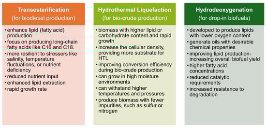 Ongoing research in hydrodeoxygenation (HDO) has focused on catalyst innovation, process optimization, and expanding its application to diverse lipid feedstocks. Catalyst innovation in HDO has received significant attention, with researchers exploring advanced catalysts, including supported metals and bifunctional catalysts, to enhance efficiency [126]. Catalyst recycling strategies, such as immobilization and regeneration, have been investigated to improve economic feasibility. Recent studies have broadened the application of HDO to diverse lipid feedstocks by considering various microalgal strains and feedstocks with different compositions. Integrating HDO with other processes has emerged as a strategy to improve overall efficiency, with researchers exploring holistic approaches to biofuel production. Recent research findings have underscored the dynamic advancements in transesterification, hydrothermal liquefaction, and hydrodeoxygenation processes [127]. These technical perspectives and the latest research insights contribute to shaping more efficient, cost-effective, and sustainable pathways for converting lipids into biofuels, particularly for algal biofuel production (Figure 3).