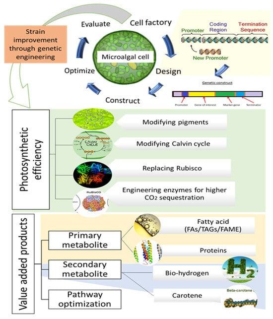 In recent years, there has been a paradigmatic shift in genetic engineering with the advent of CRISPR-Cas9 and other sophisticated tools. CRISPR-Cas9 allows for the precise and targeted modification of genetic material, offering unprecedented control over the manipulation of microorganisms for biofuel synthesis [142]. Studies have highlighted the high precision of CRISPR-Cas9 in editing the specific genes involved in lipid biosynthesis pathways. This tool enables researchers to engineer microorganisms and enhance their biofuel production capabilities precisely [143]. Recent advancements have focused on the multiplexing capability of CRISPR-Cas9, which allows the simultaneous modification of multiple genes. This accelerates the strain engineering process and addresses multiple factors that influence the biofuel yield. One such study showed that a set of tools for genome engineering in microalgae, Nannochloropsis oceanica, had been designed using Cas12a RNPs for high-throughput genome editing. This approach allows researchers to build scarless and markerless mutants, enabling them to make strains with improved traits in a shorter time frame, including increased lipid production [144]. Studies on Chlorella sorokiniana showed that employing dCas9-based gene regulation systems may significantly increase protein levels and lipid accumulation. This indicates a possible route for increasing the target compound’s titer yields relevant to biofuel production [145].