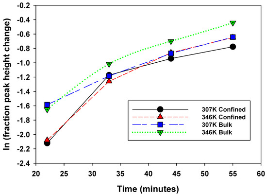 - At 22 min, there is a clear trend where the release rates of the bulk exceed those of the confined system: fractional change in peak heights of 0.2 versus 0.12, respectively,