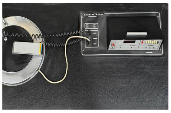 The study of the calorific value (CV) was carried out using a KL-10 calorimeter (TA Instruments Ltd., New Castle, DE, USA) (see Figure 3) [54], in accordance with established standards and methodologies. The calorific value reflects the amount of energy released when burning a unit mass of solid biofuel in an oxygen environment in a calorimeter bomb under controlled conditions. Pellet samples with a mass of 1 g were burned in an oxygen environment under a pressure of 2.8–3.0 MPa. The calorimeter bomb was placed in a vessel filled with distilled water, which allows for the accurate measurement of the released heat energy. Before conducting the measurements, the device was calibrated and validated through two tests using benzoic acid as a reference. For each brand of pellets, six repeated measurements were made at a temperature of 25 °C in a darkened room, which ensured stable experimental conditions and reduced the impact of external factors on the accuracy of the results.