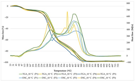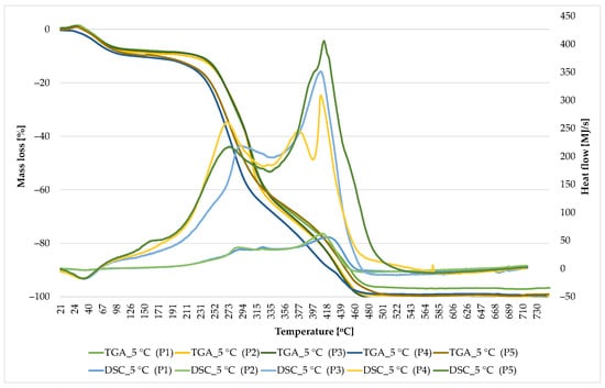 Two heating speeds were used—5 °C/min and 10 °C/min. The choice of heating rate is essential because it can affect the kinetics of the reactions that occur in the material during the analysis. The faster heating can accelerate various thermal processes, while the slower heating can allow a more complete and detailed analysis of the thermal changes.
