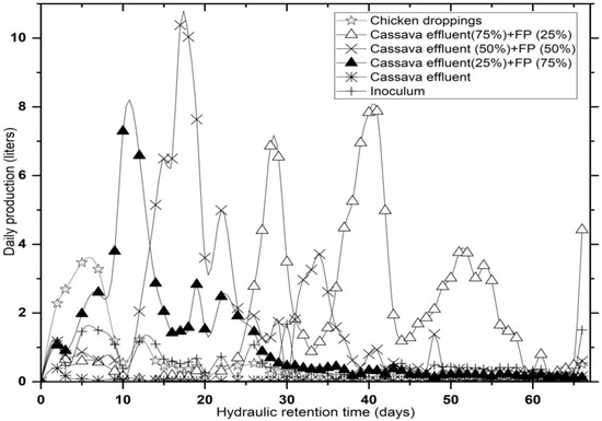 The average ambient temperature recorded during the experiments ranged from 26.3 to 45.2 °C, allowing the reactors (painted black to promote heat accumulation during the day) to be placed in mesophilic conditions (22–35 °C). As shown in Figure 1, daily biogas production increased progressively as a function of the substrate until it reached a maximum value. It was observed that reactors containing more chicken droppings produced faster than those containing more cassava effluent. Daily production is unstable, and this is linked to temperature variation. As Sharma et al., 2022 [32] have pointed out, temperature fluctuations affect bacterial activity, and as a result, biogas yield was significantly reduced. Methanogenic bacteria are responsible for this. These types of bacteria struggle to survive in their cool environment for the first ten days because they are unable to adapt to the conditions, resulting in low volatile substance consumption and reduced microbial activity. The delays in production start-up observed in some reactors are due to the toxic nature of cyanides in particular, as pointed out by Glanpracha et al., 2018 [33]. Indeed, according to Glanpracha et al., 2018 [33], the presence of cyanide during AD inhibited the methanogenic activity. However, this cyanide inhibition was temporary and reversible by nature, its degradation during anaerobic digestion consists of an initial latent phase, followed by a cyanide degradation phase [33]. It should be added that the duration of the latent phase can be influenced by the initial concentration, which partly explains the decrease in start-up time with increasing chicken effluent in the digester. It should also be noted that this dilution contributes to enriching the reaction medium with nutrients, particularly nitrogen (thus adjusting the C/N ratio). Substrates containing more cassava effluent encompass both problems (low nitrogen and high cyanide), preventing normal growth and activity of biogas-producing bacteria on the feed substrate.
