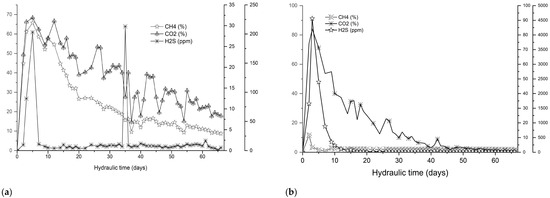The Geotech BIOGAS 5000 (Équipement scientifique—ES, Garches, France) is a portable gas analyzer for measuring the precise composition of gases in biogas applications. The data collected by this tool are consistent and help us verify the efficiency of the digestion process. When connected to the reactor, they automatically use infrared sensors to analyze the biogas produced by the reactor, displaying the exact proportion (in %) of CH4 and CO2. Using its electrochemical sensors, it quantifies oxygen content (accurate to approx. 1.5%) and hydrogen sulfide content (accurate to approx. 3%). The analyzer samples biogas continuously at a rate of 550 mL/min. Depending on the sampling time, the integrated flow meter can also be used to deduce the volume of biogas produced daily. The volume of biogas produced daily was estimated by multiplying the emptying time by the pump flow rate of the analyzer (BIOGAS5000) used, which is 550 mL/min. After each measurement, the gasometers were emptied, releasing the accumulated biogas.