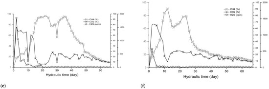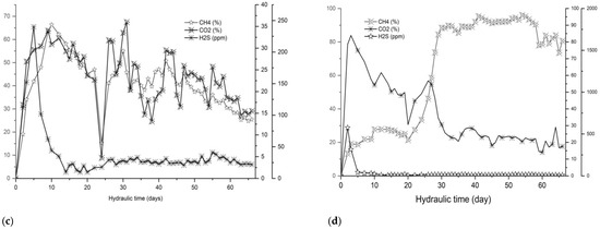 Figure 3 shows the kinetic evolution of anaerobic digestion in the various reactors over time. From Figure 3, it can be seen that from days 1 to 5 of digestion, methane production remains low in reactors R1, R3, R4, R5, and R6. On the other hand, reactor R2 (containing only chicken droppings) starts on day 2 with a methane concentration already reaching 44%. There are several reasons for these results. In the case of Reactor 1, this is due to the fact that at the start of organic matter degradation, the hydrolysis process predominates, with a high production of hydrogen sulfide (H2S) reaching 4560 ppm. This is a limiting factor for the start-up of methanogenesis. The R2 substrate (chicken droppings only), on the other hand, degrades more easily with moderate H2S production (with a maximum concentration of 213 ppm on day 35). This can be explained by the fact that this substrate is balanced (C/N = 20.48).