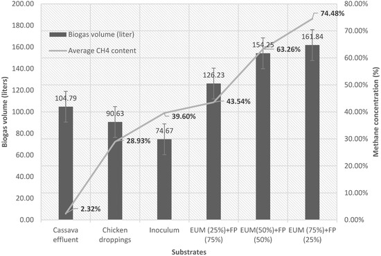 This study aims to explore anaerobic co-digestion (AcoD) of cassava (EUM) and poultry (FP) effluents using one inoculum/substrate ratio (30%) and three EUM vs. FP substrate composition ratios (25:75, 50:50, and 75:25). The AcoD process was therefore designed for 20 L batch digesters, under mesophilic conditions, with less than 5% total solids for 66 days. The results showed that EUMs were highly resistant to degradation, while FPs were the most easily degradable. Kinetic analysis indicated specific organic matter (MO) reduction rates of 0.28% per day for EUM and 0.76% per day for FP. EUM alone produced 45.47 mL/g MO, while the 50:50 substrate produced 1184.60 mL/g MOV. The main factors contributing to EUM inefficiency were the inability to tame acidic conditions and the accumulation of volatile fatty acids. AcoD produced 23 to 50 times more methane than EUM alone, 2 to 5 times more than FP alone, and 2 to 4 times more than inoculum. As a result, the AcoD of both types of waste had a qualitative and quantitative effect on biogas production. CH4 content increased from around 2 to 75%, depending on the amount of organic nitrogen added. The addition of nitrogen by AcoD, even under mesophilic conditions, improves the kinetics and quality of anaerobic digestion of low-nitrogen substrates. Its impact on thermophilic and psychrophilic conditions needs to be verified.
