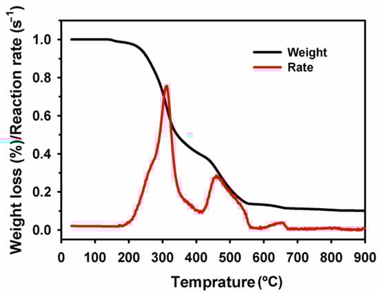 The primary degradation process begins around 180 °C, with the decomposition of lipids and the release of a small quantity of residual bound moisture (Figure 2). As the temperature continues to rise, hemicellulose begins to degrade, followed by the decomposition of cellulose. Most of the mass loss, approximately 65%, is observed between 180 and 350 °C, corresponding to the breakdown of these two significant components [,]. At higher temperatures, lignin decomposition occurs, contributing to a substantial weight loss of around 25% in the temperature range of 420–550 °C. Beyond this, a minor mass loss may be observed, potentially due to the catalytic effects of ash interacting with fixed carbon, leading to the formation of carbonates. The DTG curve further highlights the temperature ranges in which maximum decomposition occurs. The first peak is observed at around 310 °C, corresponding to the maximum reaction rate primarily associated with the degradation of hemicellulose and cellulose []. The second phase, corresponding to lignin degradation, occurs within the 420–550 °C temperature range, with the highest conversion rate at 451 °C. Hemicellulose and cellulose are primarily responsible for the significant mass loss in the 180–350 °C range, while lignin degradation dominates the 420–550 °C range. These findings agree with established literature, which reports similar degradation patterns for various biomasses [,,,,,]. The moisture content of banana tree waste, slightly higher than that of other biomass types, contributes to an increased energy requirement for pyrolysis due to the need to evaporate excess water before the onset of the main decomposition processes []. The TG and DTG curves provide a clear understanding of the pyrolysis behavior of banana waste, offering insights into the temperature-dependent behavior of its components and the resulting product distribution during thermal conversion [,].