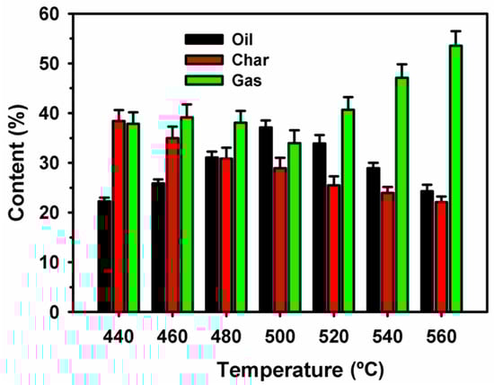 As the temperature increases, the oil yield initially rises, peaking near 500 °C, before gradually declining with further temperature increases. This initial rise in oil yield can be attributed to the thermal decomposition of hemicellulose and cellulose, which release volatile compounds such as acids, ketones, and anhydrous sugars, essential precursors in bio-oil formation [,]. However, the oil yield declines at higher temperatures due to the increased production of non-condensable gases and reduced char content []. The char yield steadily decreases with increasing temperature, dropping from around 40.0% at 440 °C to below 30.0% at 560 °C. This reduction aligns with typical pyrolysis behavior, where higher temperatures promote biomass volatilization, leaving less solid residue behind [,]. Although lignin contributes to some char formation, the yield diminishes as more biomass is converted into volatile compounds and gases [,]. Conversely, the gas yield significantly increases as the temperature rises, going from approximately 30% at 440 °C to over 50% at 560 °C [,]. This trend is primarily driven by the degradation of lignin and other biomass components, which produce larger volumes of non-condensable gases at elevated temperatures [,,]. The graph (Figure 3) underscores the influence of temperature on product distribution during banana waste pyrolysis. As the temperature rises, there is a consistent increase in gas production, a continuous reduction in char yield, and an initial increase in bio-oil yield followed by a decline at higher temperatures, which was in line with the published literature [,,,]. For further studies, the optimal temperature of 500 °C was selected based on the high conversion of biomass into bio-oil without any detrimental effects.