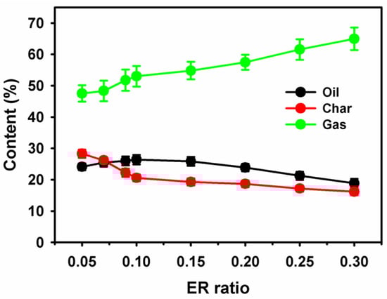 Effect of ER ratio on banana mix waste pyrolysis products in a fluidised bed reactor at a temperature of 500 °C.