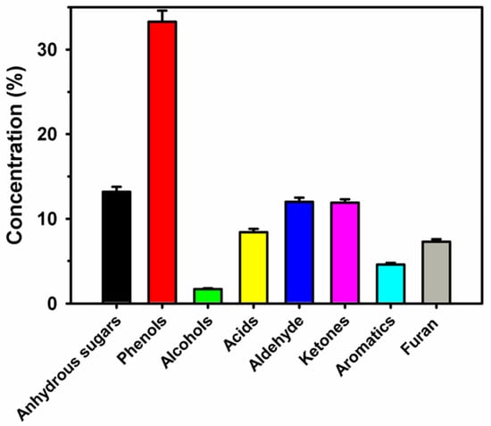 A relative percentage of the different component groups in bio-oil derived from banana mix waste obtained at 500 °C.