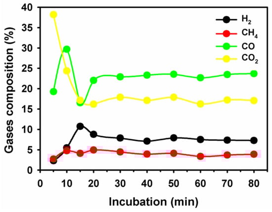 The concentration variation of pyrolytic gas components over 60 min after stable operation (20 min).