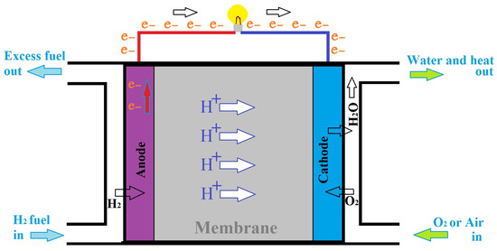 PEMFC is an electrochemical device that efficiently converts chemical energy to electrical energy according to its internal reactions. The cell consists of two catalyst-coated electrodes (anode and cathode) and a solid polymer electrolyte is placed between the electrodes as shown in Figure 1. From the figure, it is clear that the hydrogen is fed through the anode inlets to reach the surface of the catalytic material of the electrode, which activates the membrane reaction. The reaction starts by splitting the hydrogen into protons which migrate across the membrane to reach the cathode and electrons which flow in the electrical external circuit. The oxygen atoms are fed through cathode inlet units with the migrated hydrogen protons to form water molecules [1,2,19,37].