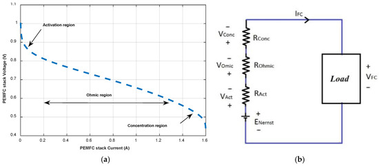 (a) The PEMFC polarization (or characteristic) curve. (b) The equivalent electrical circuit in the PEMFC model.