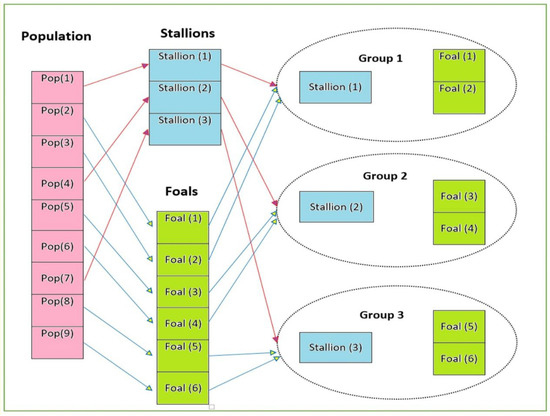 The wild horses are sectioned into groups where represents the number of horses within population and represents the number of group leaders (stallions) given as , where is the percentage of leaders out of the total population. The stallion leads his group, so the number of stallions equals the number of groups. The rest of the population is considered to be mares and foals, as described in Figure 3.