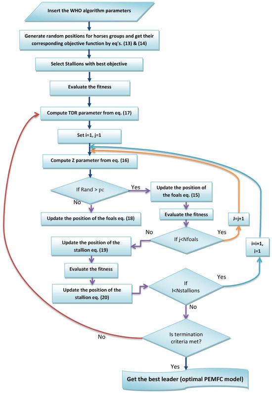 Similar to any optimization algorithm, the WHO randomly creates its first population of horses as shown in Equation (13) and its corresponding objective function is calculated as shown in Equation (14). A repetitive iterations process is performed to enhance the objective results of horses.