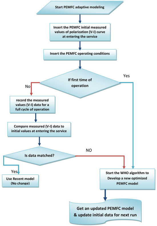 Modeling an efficient adaptive PEMFC throughout its lifetime is the main target. In this context, updating the PEMFC model online can reflect the real characteristics of the aged cell membrane. This can achieve the proper control and operation of the cell and elongates its lifetime by avoiding undesired control orders [12]. Hence, this work proposes an adaptive modeling method that efficiently updates the PEMFC model. The update mechanism in the method depends on measuring the PEMFC terminal voltage–current during a full cycle of operation; thereafter, the aggregated data set is compared to the original data on the characteristics of the cell to explore any variation in the cell performance. The result of this comparison activates/deactivates the method to develop an updated model. The merits of the proposed WHO algorithm-based method are flexibility, simplicity and a low computational burden, so it can reduce the need for costive high-capability control systems. The proposed method mechanism is depicted in the flowchart in Figure 5.