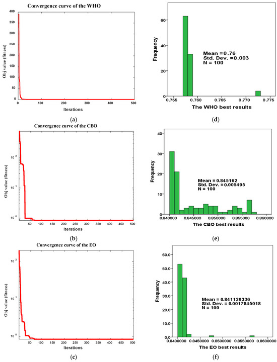 Another round of investigations was performed, in which the convergence curves of the closest competitors (WHO, CBO, and EO) were to plotted check their performance, as depicted in Figure 6a–c, respectively. According to Figure 6a, it is clear that the WHO algorithm performed better than CBO and EO in terms of quickly providing a solution. This makes the WHO valid for the objective of online adaptive modeling in this work. On the right side of Figure 6, Figure 6d–f depict histograms of the best solutions of the closest competitors (WHO, CBO and EO), respectively. It can be noticed that for the EO, most of the best solutions are distributed between the values of 0.841 and 0.845, but some solutions are far from this range. This point moderately decreased our expectations of the solutions provided by the EO algorithm. In Figure 6e the CBO histogram shows a wider distributed range of results between (0.84 and 0.86). Moving on to Figure 6f, it is remarkable that most of the solutions are concentrated in a very narrow band with the best result of 0.75. Which supports the reliability of the WHO in finding the best solutions.