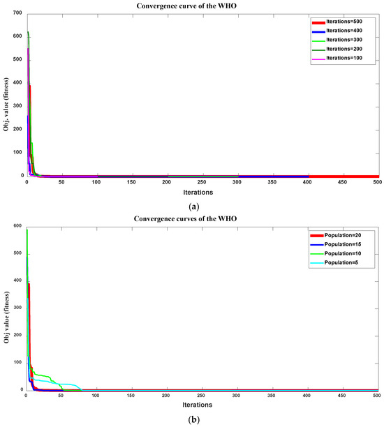 The WHO-based method’s convergence curves (a) under different iteration times; (b) under different population sizes.