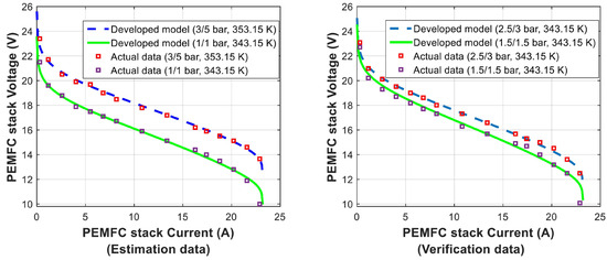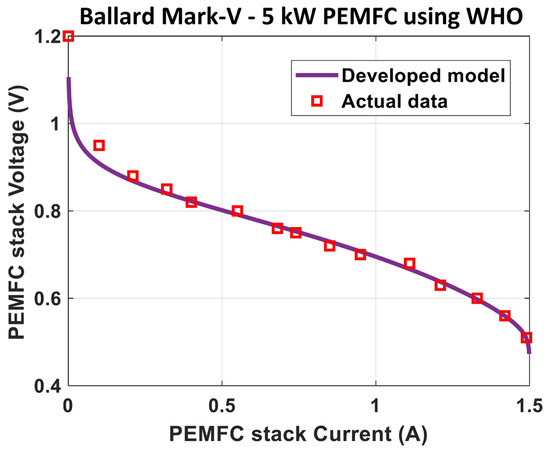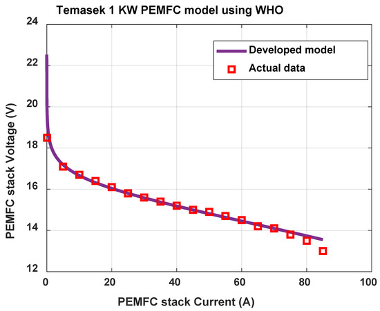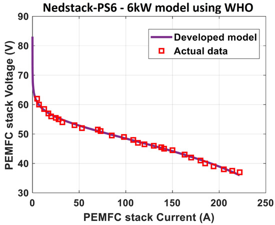 As shown in the above remarks, the fast and accurate performance of the WHO creates a clear impression of its reliability in adaptive PEMFC modeling and real-time applications. The reliability of the developed model of the 250 W PEMFC under different operating conditions is expressed by the characteristic curves shown in Figure 8. The developed polarization (V-I) curves show an outstanding match with the actual experimental data for the cell.