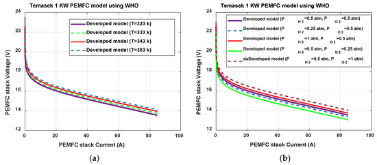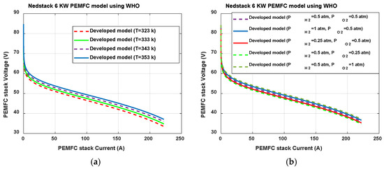 The procedure was repeated by applying the WHO-based method to model the commercial device named Ballard-Mark-V—5 kW PEMFC. The solution is listed alongside the comparative methods in Table 9 and the developed characteristic curve is displayed in Figure 13, respectively. The results confirm the accuracy of the WHO-based method by scoring the minimum SSE and minimum consumed time of 0.0006098 and 0.24 s, respectively. The developed characteristic curve depicted in Figure 13 reveals another example of the model’s superiority as it has a perfect match with actual data points for the device. The Ballard Mark-V—5 kW device is supposed to operate under different operating conditions. The modeling process is fed the data for device temperature, using values of 323, 333, 343, and 353 in kelvins (k) and pressures of hydrogen and oxygen as (), (), (), () and () per atmospheric pressure (). The resulting model curves are displayed in Figure 14a,b. The figures describe the promising capability of the proposed method in reflecting the cell performance under different operating conditions. The second stage results confirmed the reliability and speed of the proposed WHO-based method, so it is nominated for the online modeling of PEMFCs.