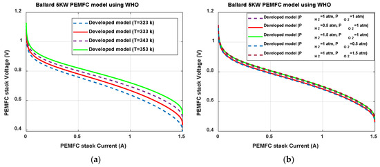 The Ballard Mark-V—5 kW model’s curves at (a) different operating temperatures and (b) different operating pressures.