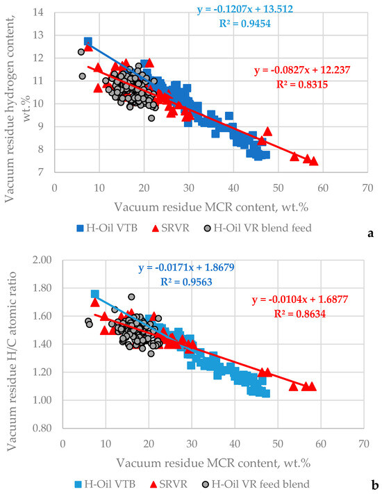 It is evident from the data in Figure 9 that both SRVRs and H–Oil VTBs exhibit linear correlations of the properties H content, H/C atomic ratio, microcarbon residue, and density, but the slope for the primary and secondary vacuum residues is different.