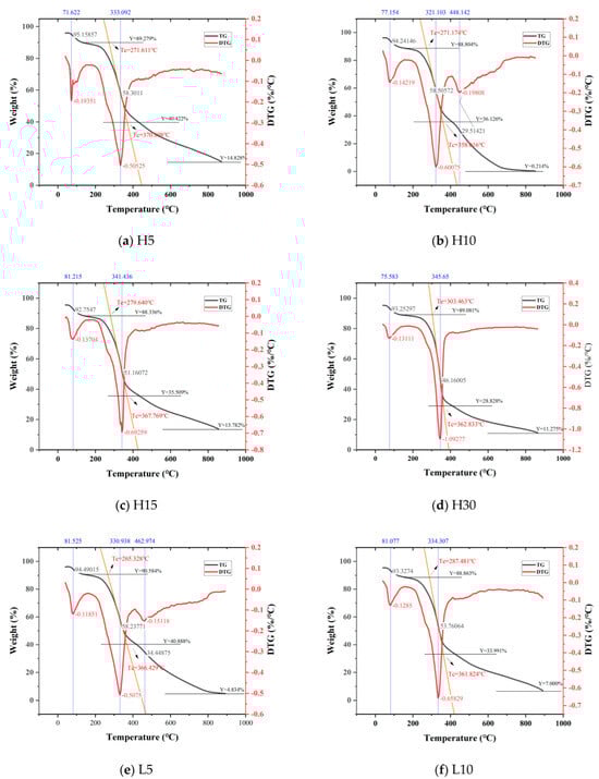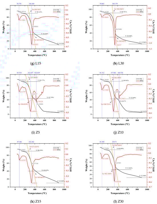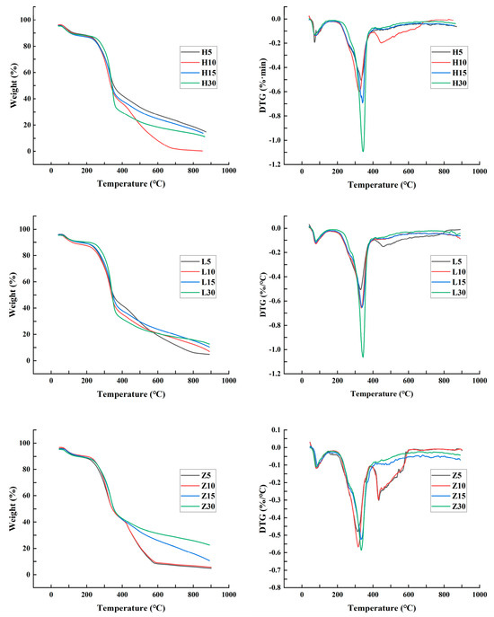The third stage of moxa floss pyrolysis is the carbonization stage, with a temperature range of approximately 430 °C to 900 °C. In this stage, as deeper volatiles further diffuse outward, they form a porous but more stable carbon structure. Typically, both TG and DTG curves tend to flatten during this phase. However, compared with other samples, H10, L5, Z5, and Z10 exhibit a third peak in their DTG curves. This phenomenon may be attributed to either higher lignin content in these moxa floss samples or the presence of more impurities, resulting in more complex compositions that increase the difficulty of thermal decomposition, consequently leading to reduced mass loss rates and additional mass loss peaks.