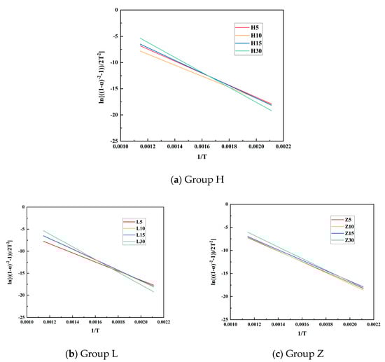 The Coats–Redfern integration method [,,] was chosen to analyze the experimental data dynamically and to solve its kinetic parameters.