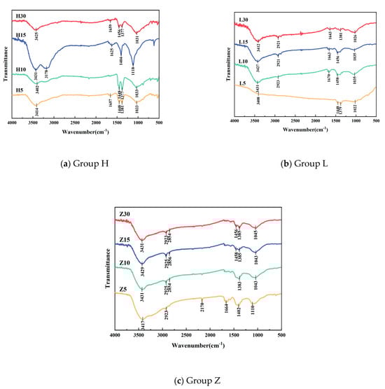 The analysis of the FTIR spectra reveals characteristic peaks corresponding to distinct functional groups and chemical bonds. The systematic identification and analysis of these peaks enables the determination of the types and distribution patterns of functional groups present in the carbonized moxa products [,].