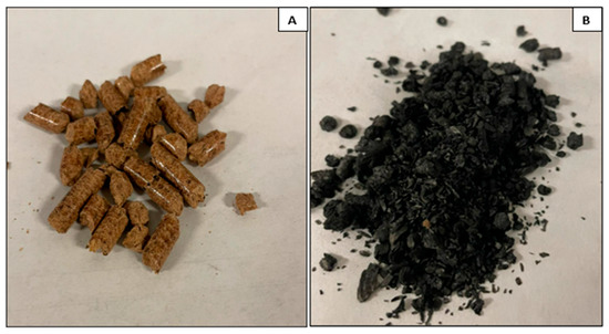 (A) Image of oak pellets and (B) image of the gasified oak biochar.