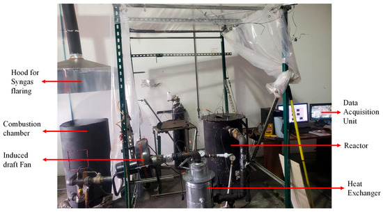 The use of a downdraft gasifier (see Figure 2) offers several advantages in making biochar. The design of a downdraft gasifier makes it possible for the effective conversion of varieties of biomass, which includes straws, wood chips, and pellets [16]. The downdraft fixed-bed reactor is designed with two cylindrical sections—an inner reactor core and an outer syngas plenum. The reactor core, made of carbon steel, has an internal diameter of 0.20 m and stands at 0.48 m tall. A wire mesh, fastened by a chain at the bottom, supports the biomass bed while allowing ash to be continuously discharged. The syngas plenum is created by the space between the two cylinders and is enclosed by a donut-shaped metal plate. The outer cylinder has a diameter of 0.5 m and a length of 0.9 m.