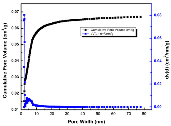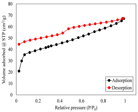 The 44-datapoint BET analysis shows that the oak biochar sample has a surface area of 88.97 m2/g, a pore width distribution of 1.78–77.698 nm, and absorbed a volume of 67.05 cm3/g of nitrogen gas with a cumulative pore volume of 0.0670 cm3/g. Table 1 summarizes the BET analysis of the oak biochar sample. Oak biochar shows a hysteresis loop as shown in Figure 4, indicating that oak biochar is mesoporous, with pore sizes ranging from 2 to 50 nm [22]. These results are also supported and aligned with studies by Lu and Zong [23]. Mesoporous materials like oak biochar find applications in energy storage, catalysis, environmental remediation, wastewater treatment, air purification, gas separation, and carbon capture [24,25,26].
