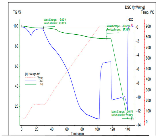 The changes in mass, temperature, and time, were analyzed on a dry basis of the biochar. Thermogravimetric analysis (TGA) and differential scanning calorimetry (DSC) were used to quantify and evaluate the thermal stability of the oak biochar [4,27,28,29]. Figure 6 shows the thermogravimetric and thermogram curves.