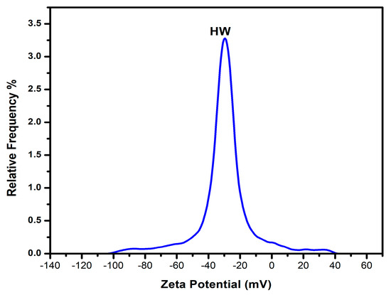 The zeta potential, electrical conductivity, electrophoretic mobility, and pH are properties of biochar that effectively influence its applications. The zeta potential of biochar represents its surface charge in a solution. Biochar generally displays negative zeta potential values over a broad pH range, reflecting the presence of negative surface charges. As the pH increases, the zeta potential becomes more negative, primarily due to the adsorption of hydroxide ions (OH⁻) and other anions onto the biochar surface. This property is closely linked to biochar’s capacity for immobilizing heavy metals and retaining water. The zeta potential of the biochar surface is a product of the electronegativity strength and stabilizing performance of biochar that is colloidal in soil [62,63]. The study analyzes the movement of biochar under an electric field—its electrophoretic mobility. A plot of relative frequency and zeta potential is shown in Figure 11.