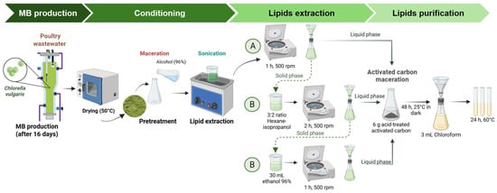 These samples were then placed in sealed beakers to prevent solvent evaporation. The samples were allowed to macerate for 48 h in the dark at room temperature (25 ± 0.5 °C). After this period, the samples were filtered using Whatman filter paper and a separatory funnel. To facilitate the extraction of purified lipids, lipids were extracted utilizing 3 mL of chloroform as a non-polar solvent in a chloroform–methanol extraction to recover the lipids from the biomass [44] (see Figure 1).