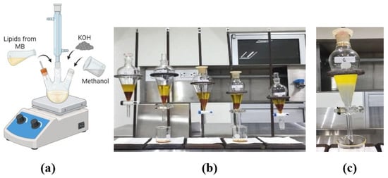 Figure 2. Sequence of biodiesel generation using alkaline transesterification (KOH): (a) assembly of the transesterification process; (b) separation of biodiesel (upper phase), glycerin, and residues (lower phase); (c) separation of biodiesel and byproducts following final washing.