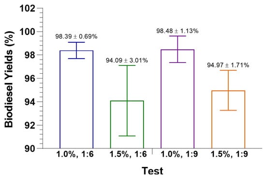 Yields obtained from the production of biodiesel from lipids extracted from the MB of C. vulgaris from a culture in wastewater from the poultry industry were higher than 94% (Figure 4) when different molar ratios were applied through alkaline transesterification. The highest yields were obtained with 1% KOH at molar ratios of 1:6 and 1:9. The results align with those reported by López, Bocanegra, and Malarón-Romero [66], indicating that a 1% catalyst yields the highest outputs. This is due to elevated KOH concentrations, which enhance the saponification reaction, thereby hindering the transesterification process and reducing biodiesel conversion efficiency [67]. In this work, the highest yield achieved was 98.48 ± 1.13%, which is higher than obtained from cooking oil [68].