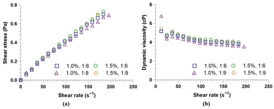 Figure 5. Rheograms of biodiesel produced by alkaline transesterification: (a) shear stress (Pa) and (b) dynamic viscosity (cP) vs. % KOH, oil–methanol ratio variations.