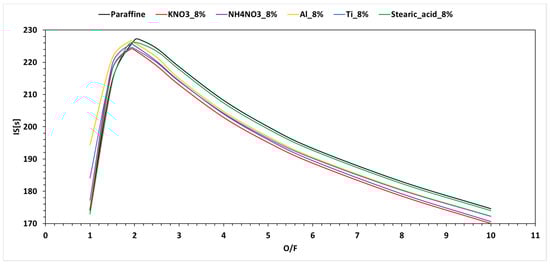 Variation of specific impulse as a function of oxidizer-to-fuel (O/F) ratio, obtained through simulations using the ProPEP Version 1.0.3.0 software for pure paraffin and paraffin with 8% additions of KNO3, NH4NO3, Al, Ti, and stearic acid.