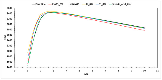 Variation of combustion temperature as a function of oxidizer-to-fuel ratio, obtained through ProPEP Version 1.0.3.0 software simulations for pure paraffin and paraffin with 8% additions of KNO3, NH4NO3, Al, Ti, and stearic acid.